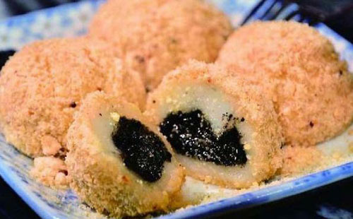 10、擂沙圓 擂沙圓是上海喬家柵點心店的風味名點之一,已有70多年的歷史。相傳在清代末年,上海三牌樓一帶有一姓雷的老太太,她為了使湯團便于存放和攜帶,首創了在煮熟的湯團表面滾白粉的辦法,后人為了紀念她,就把這種湯團取名擂沙圓。喬家柵點心鋪經營的擂沙圓是將崇明縣大紅袍赤豆煮熟后磨成沙,曬干后即成紫紅色的粉,然后,把包有鮮肉或豆沙、芝麻等各式餡心的糯米湯團煮熟,瀝干水分,滾上一層豆沙粉。這種湯團,有色有香、熱吃有濃郁的赤豆香味,而且軟糯爽口,攜帶方便,一直深受游客的歡迎。